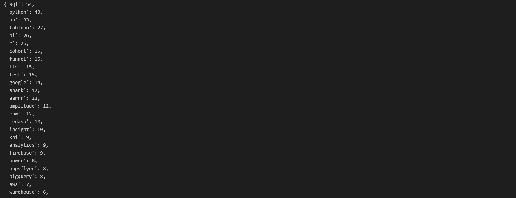 cleaned_counted_ranked = dict(cleaned_counted.most_common()) # 빈도수 내림차순 정렬 후 딕셔너리화