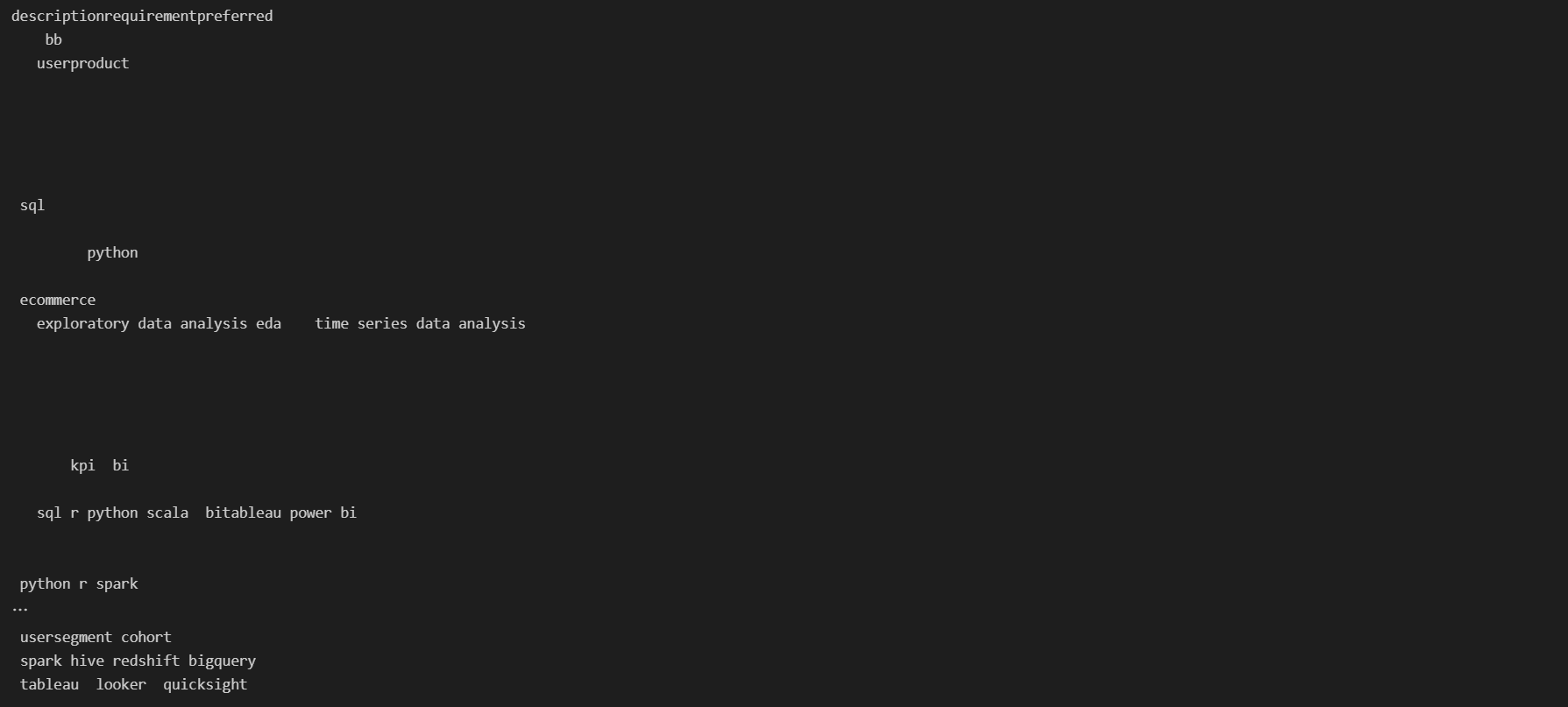 stop_words = ['data','descriptionrequirementpreferred'] # 불용어 사전 만들기