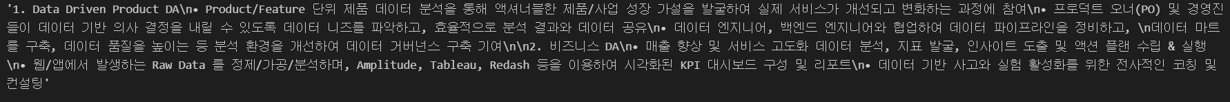하나로 합쳐진 txt 파일을 text라는 변수로 저장하여 불러왔다. 앞서 살펴본 것과 같은 데이터 전처리가 필요함을 알 수있다. 텍스트 분석에서는 주로 정규표현식을 이용하여 위의 이슈를 해결한다. 정규 표현식을 활용할 때는 어떠한 형태의 텍스트만 남길 것인 지를 고민해야 한다. 위의 raw data에서 살펴보면 기술 스택이나 업무 등은 영어로 비교적 깔끔하게 기재되어 있음을 알 수 있다. 따라서 영어 대문자와 소문자만 남기면 'Tableau', 'Amplitude', 'Redash' 등의 시각화 툴을 가져올 수 있다.
