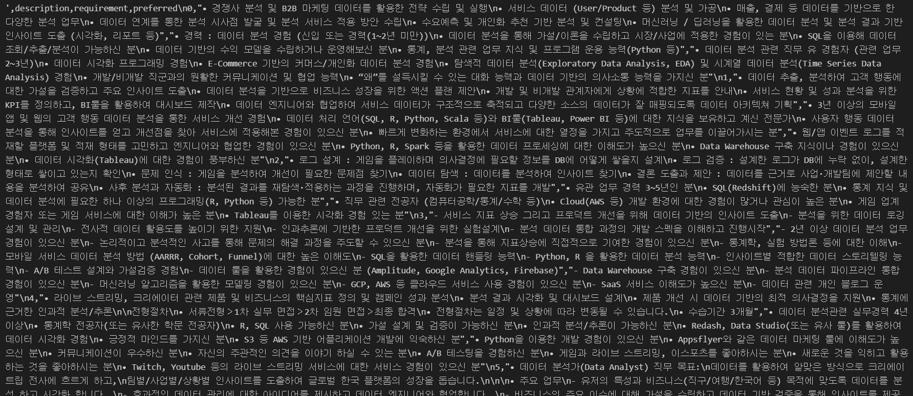 stop_words = ['data','descriptionrequirementpreferred'] # 불용어 사전 만들기