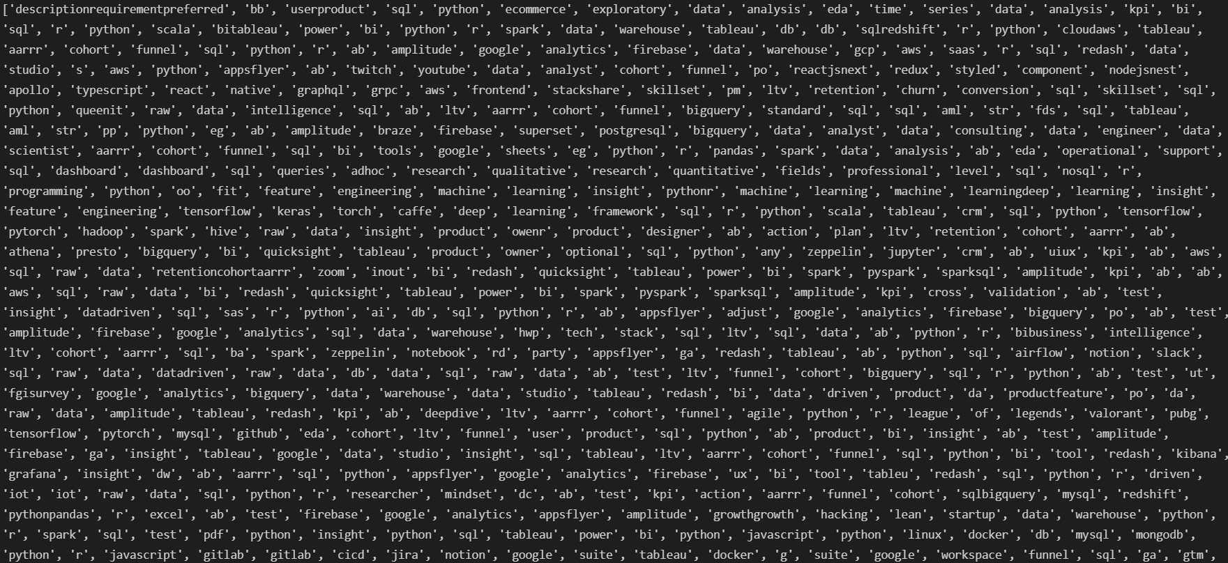 여기까지 기술 스택 분석을 위한 데이터 전처리를 진행했다. 데이터 전처리는 어떤 아웃풋을 원하는가에 따라 결정된다. raw data 단계에서 이미 기술 스택들이 영어 단어 형태로 잘 정리되어 있었기 떄문에 비교적 손쉽게 전처리를 진행할 수 있었다. 그러나 앞으로 big data나 소스가 여러 곳인 데이터들을 전처리하려면 정규표현식에 대해 조금 더 깊은 이해가 필요하다고 생각한다. 또한 앞으로 다양한 raw data를 다뤄보면서 발생하는 이슈들을 정리해 나가고자 한다.