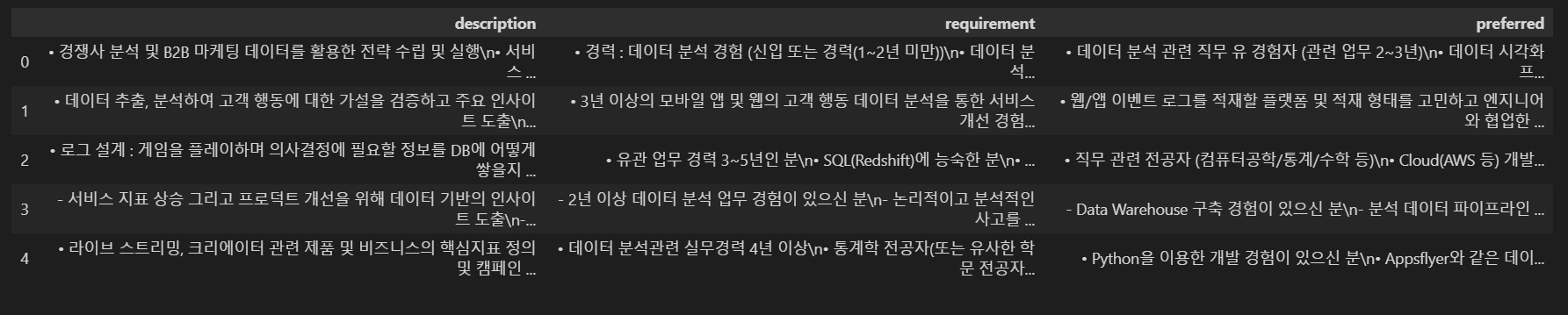 수집한 raw data의 csv파일을 로드하여 데이터 프레임으로 구성한 뒤 분석에 필요한 부분 주요업무, 자격요건, 우대사항만을 컬럼으로 가져와 새로운 데이터프레임으로 구성하였다.