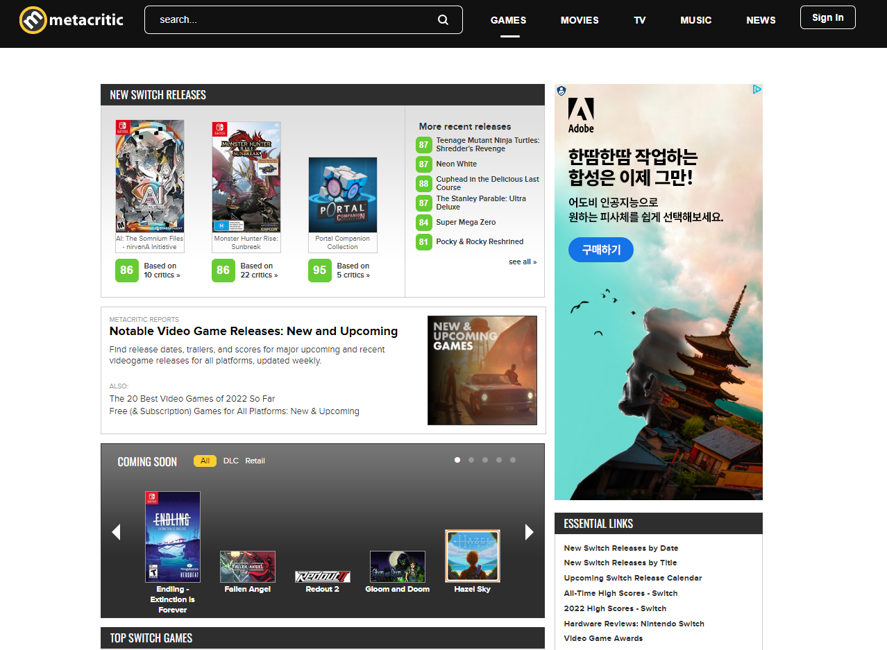 위의 화면은 닌텐스 스위치 플랫폼의 게임에 대한 메타크리틱 화면이다. 각각의 게임 타이틀에 대해 점수가 매겨져 있는 것을 알 수 있다.