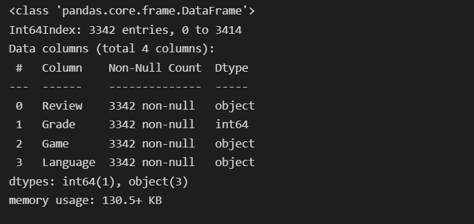 위의 리뷰는 스페인어로 작성되었다. metacritic은 전세계 유저가 모두 이용하는 사이트로 raw data를 대략적으로 확인한 결과 포르투갈어, 스페인어, 일본어, 중국어 등의 리뷰가 있었다. 특히 스페인어의 경우 상당히 많은 수의 리뷰가 있었다. 약 4000개의 리뷰 데이터를 직접 확인해서 제거할 수도 없으니 영어 외의 다른 언어를 분류하여 인덱스를 추출해야 하는 상황이었다. 이 때 적용한 라이브러리가 파이썬 언어감지 라이브러리 langid 이다.