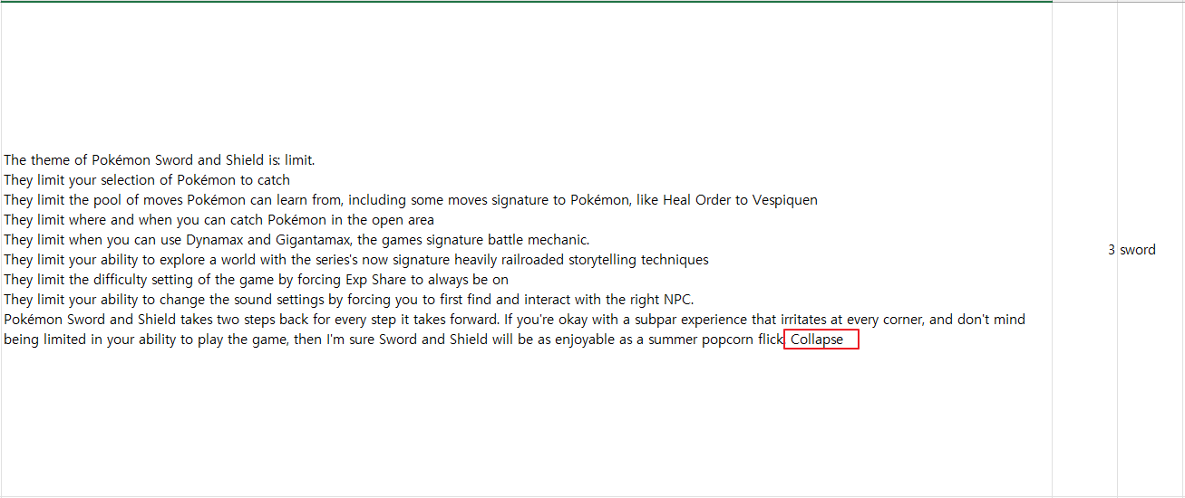 저번 포스팅의 크롤링 이슈에서 매 리뷰마다 'expand'를 클릭해야 전문을 볼 수 있는 문제가 있었다. expand 버튼을 클릭하면 'collape'로 바뀌고 전문을 크롤링하는 과정에서 해당 단어도 같이 포함되어 마지막에 남았다. 따라서 긴 리뷰의 경우 해당 단어를 포함하는 경우가 많아 전처리 단계에서 제거해야 했다.