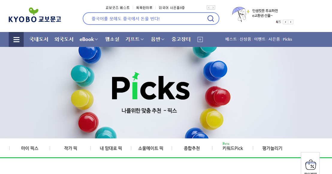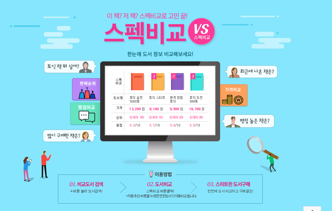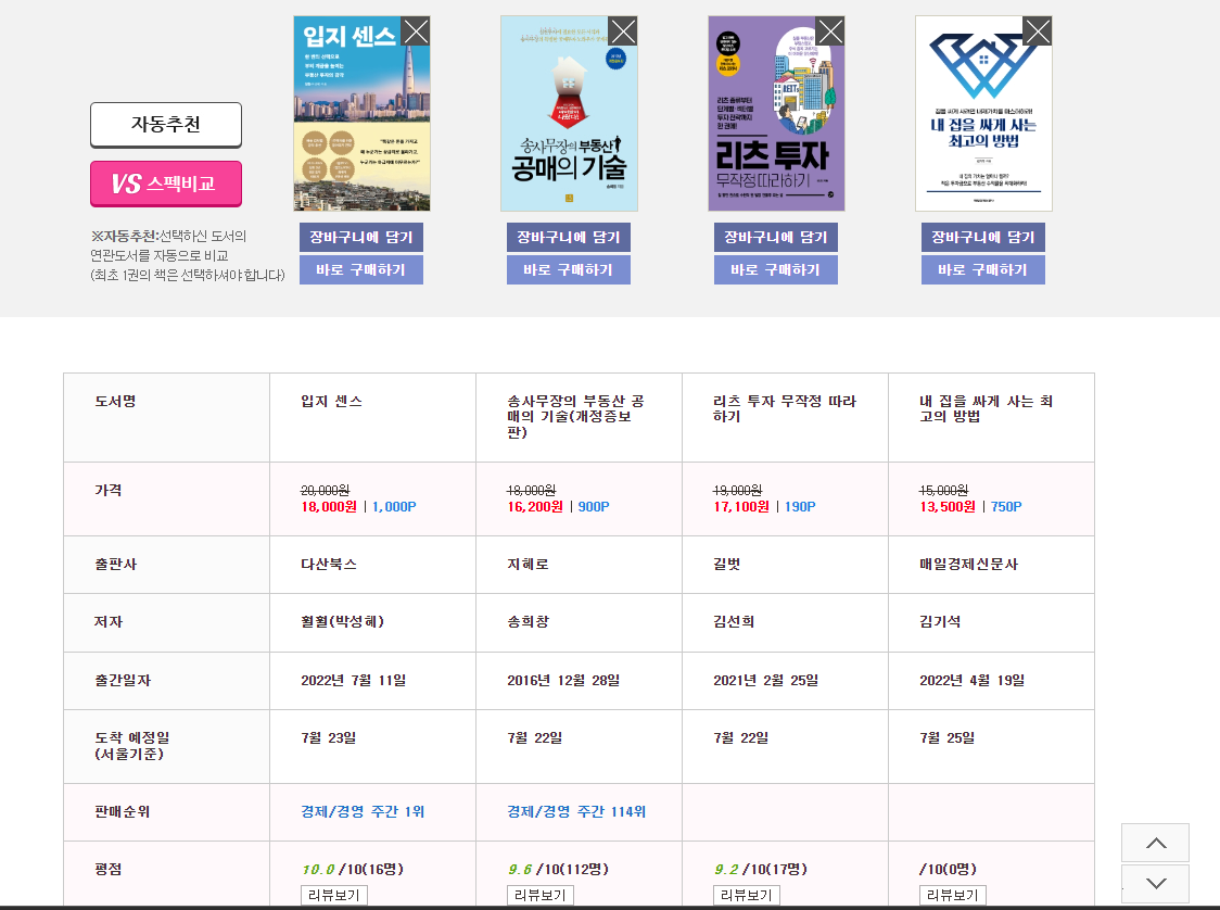 교보문고도 이미 추천서비스를 제공하고 있다. 회원 맞춤, 작가, 키워드, 스펙 비교 등의 여러가지 테마로 추천시스템을 적용하고 있다. DB 측면에서 교보문고의 서비스를 따라갈 수는 없겠지만 raw data에 알고리즘을 적용하는 실습 프로젝트로서는 매우 적합한 대상이라 할 수 있겠다.