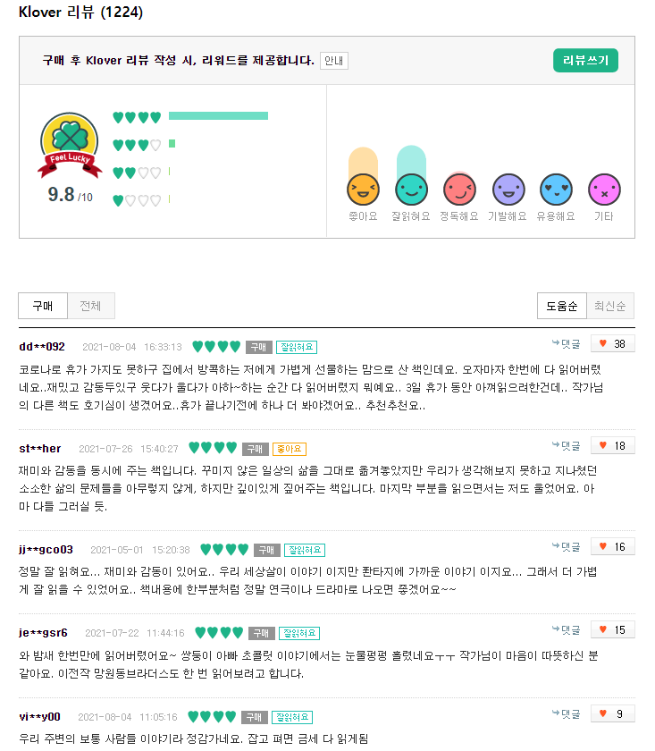 Klover 서비스로 독자들의 리뷰와 평점을 제공하고 있다. 데이터 보호의 측면에서 유저 정보는 마스킹 처리 되었있으므로 그대로 게시한다. 만약 동일한 아이디로 여러 도서를 구매하고 평점을 매겼다면 CF 알고리즘의 적용이 가능할 것이다.
