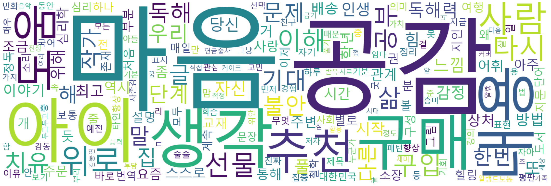 주로 '마음', '공감','위로','불안'과 같은 감성적인 키워드가 압도적으로 빈출되었다. 위의 소설 카테고리에 대한 분석에 이어 코로나시대에 정서적인 공감에 대한 욕구와 COVID BLUE를 해소할 수 있는 키워드인 것으로 생각된다.