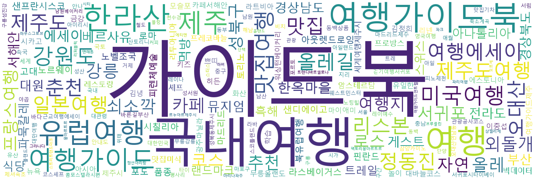여행 카테고리의 키워드 분석이다. 해당 프로젝트는 22년 3월 경의 베스트셀러를 대상으로 하였으므로 코로나가 한참 절정에 다다른 시기의 데이터이다. 따라서 현재의 엔데믹 상황과는 키워드에서 차이를 보일 것이다.