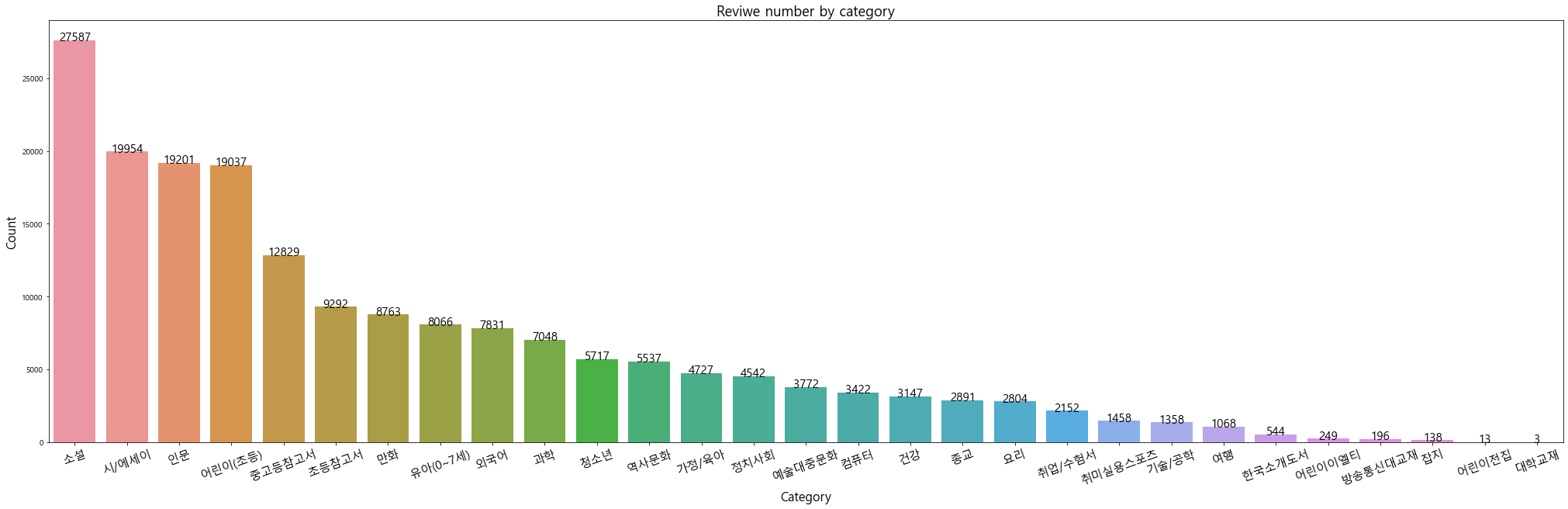소설이 가장 많은 27587건의 리뷰수를 기록하였으며 시/에세이, 인문이 뒤를 이었다. 보통 판매량이 많은 베스트셀러의 경우 리뷰 또한 많았다.