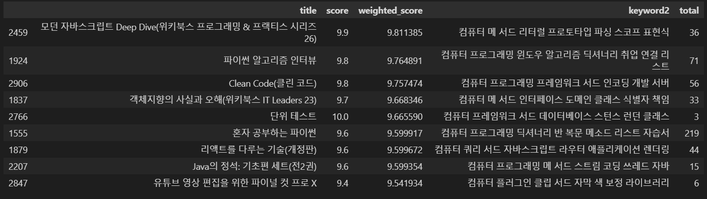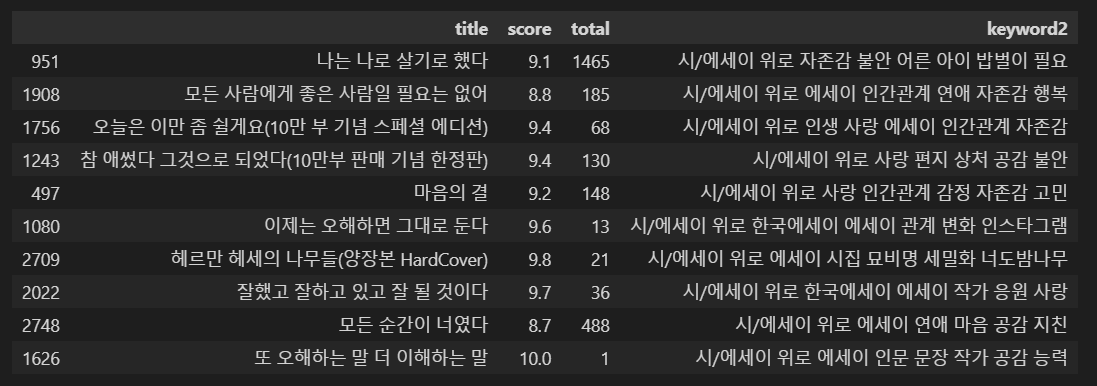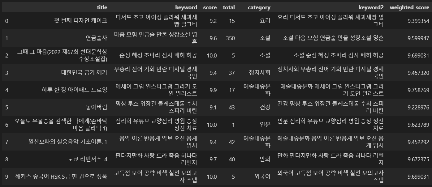 위의 추천 결과는 교보문고의 키워드를 그대로 사용한 결과이다. 이는 각 도서마다 키워드 선정이 지나치게 지엽적이기 때문에 개별 데이터 사이의 공통된 키워드가 적기 떄문잉다. 따라서 위에서 상기한 대로 공통 키워드로서 책 분야, 카테고리를 추가하였다.