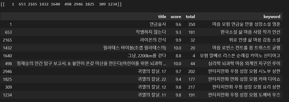 소설이라는 공통 키워드를 추가한 형태가 훨씬 추천 성능이 좋음을 알 수 있다.