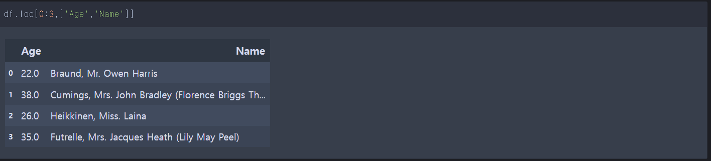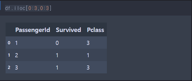 * 행의 index를 이용, 아래의 titanic 자료는 행의 index가 행의 순서와 같기 떄문에 df.loc[0:3] 가능
