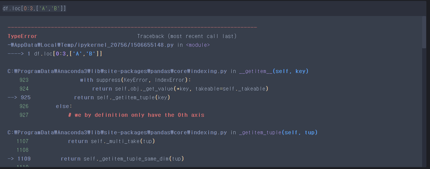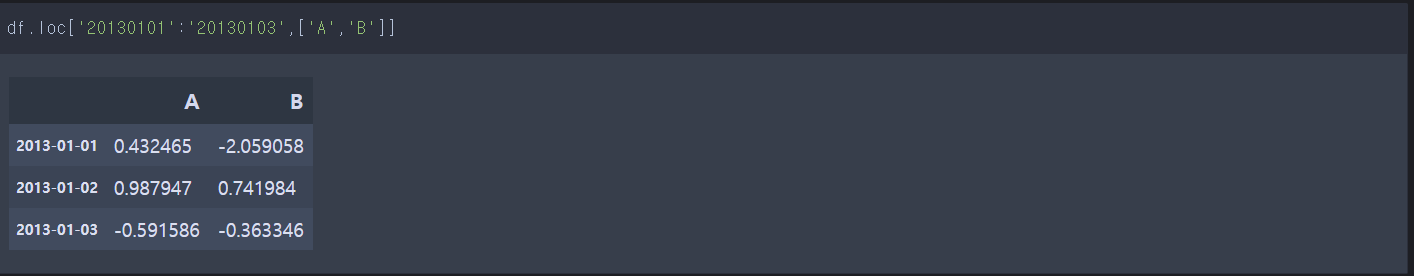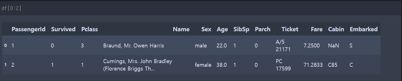 - df[0:2] : 행 인덱스로 데이터 프레임 슬라이싱