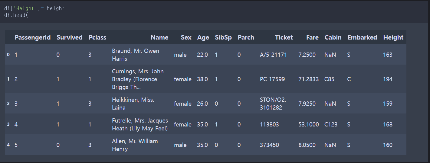 컬럼명 Height 로 dataframe에 열 추가