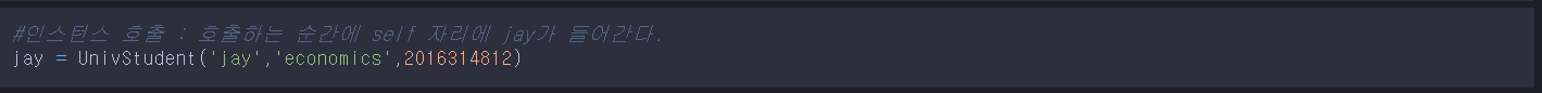 - 인스턴스 호출 : 인스턴스이름=클래스이름(__init__()함수의 매개변수 인자들)