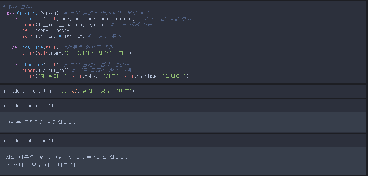 introduce = Greeting('jay',30,'남자','당구','미혼')