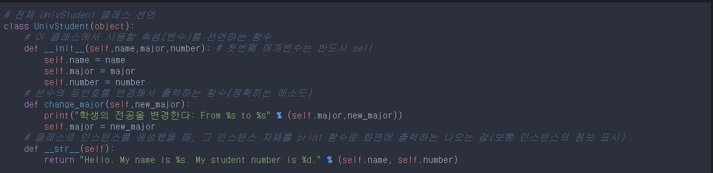 - 클래스 선언 : 클래스 예약어 클래스 이름 (상속받는 객체명) → class SoccerPlayer(object)