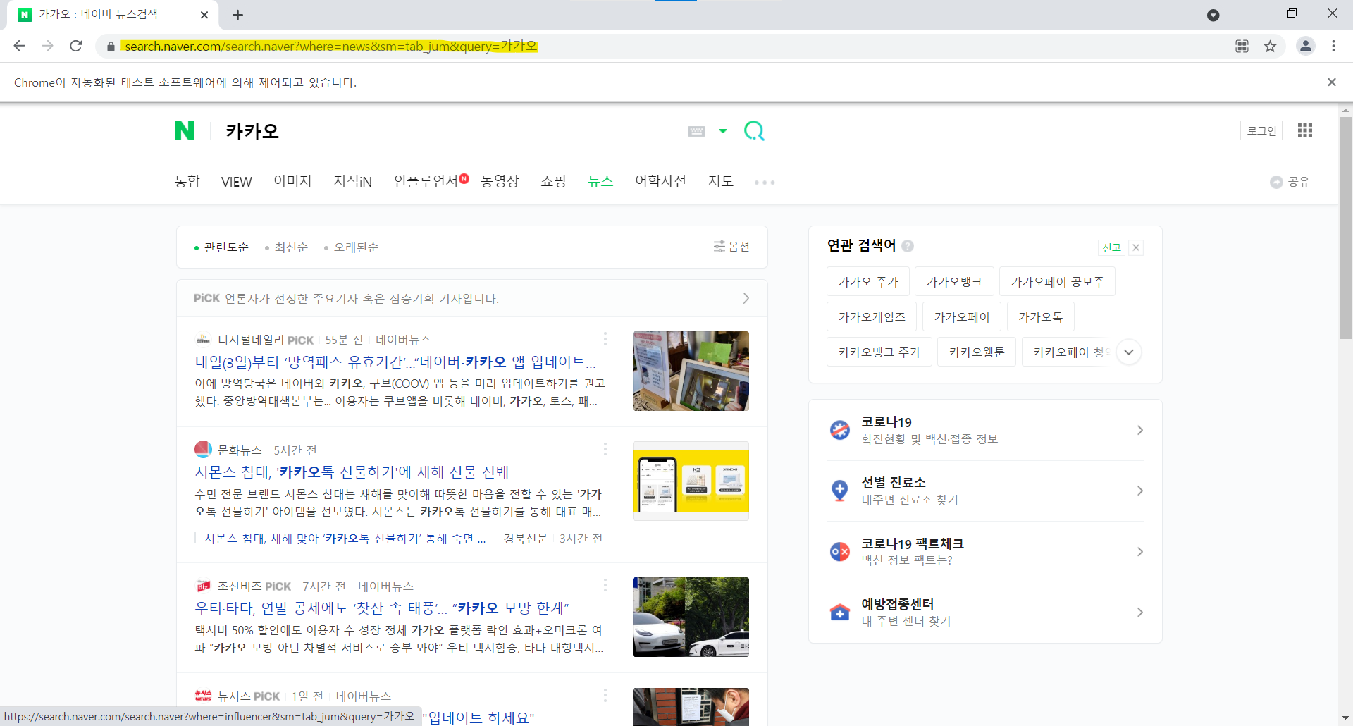 지난 번 네이버 블로그 크롤링과 유사하게 네이버에서 키워드 검색 후 관련 뉴스 기사 크롤링을 실습해 본다. 마찬가지로 처음에는 자동검색을 통해 url들을 수집한 뒤 pandas로 데이터프레임화 한 후 csv로 저장한다. 그 다음 csv를 로드한 뒤 url을 하나씩 열어 기사 본문과 댓글, 좋아요 등의 감정 수집까지 진행한다. 역시나 처음에는 전체 구조를 for문으로 만들기 전에 하나의 기사로 코드를 실험한다.