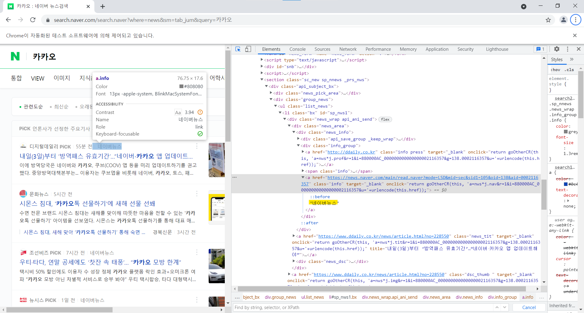 - driver.get(url) : 네이버 메인화면에서 검색 창에 키워드를 입력 후 뉴스 탭을 클릭한 url 자체를 넣어준다.