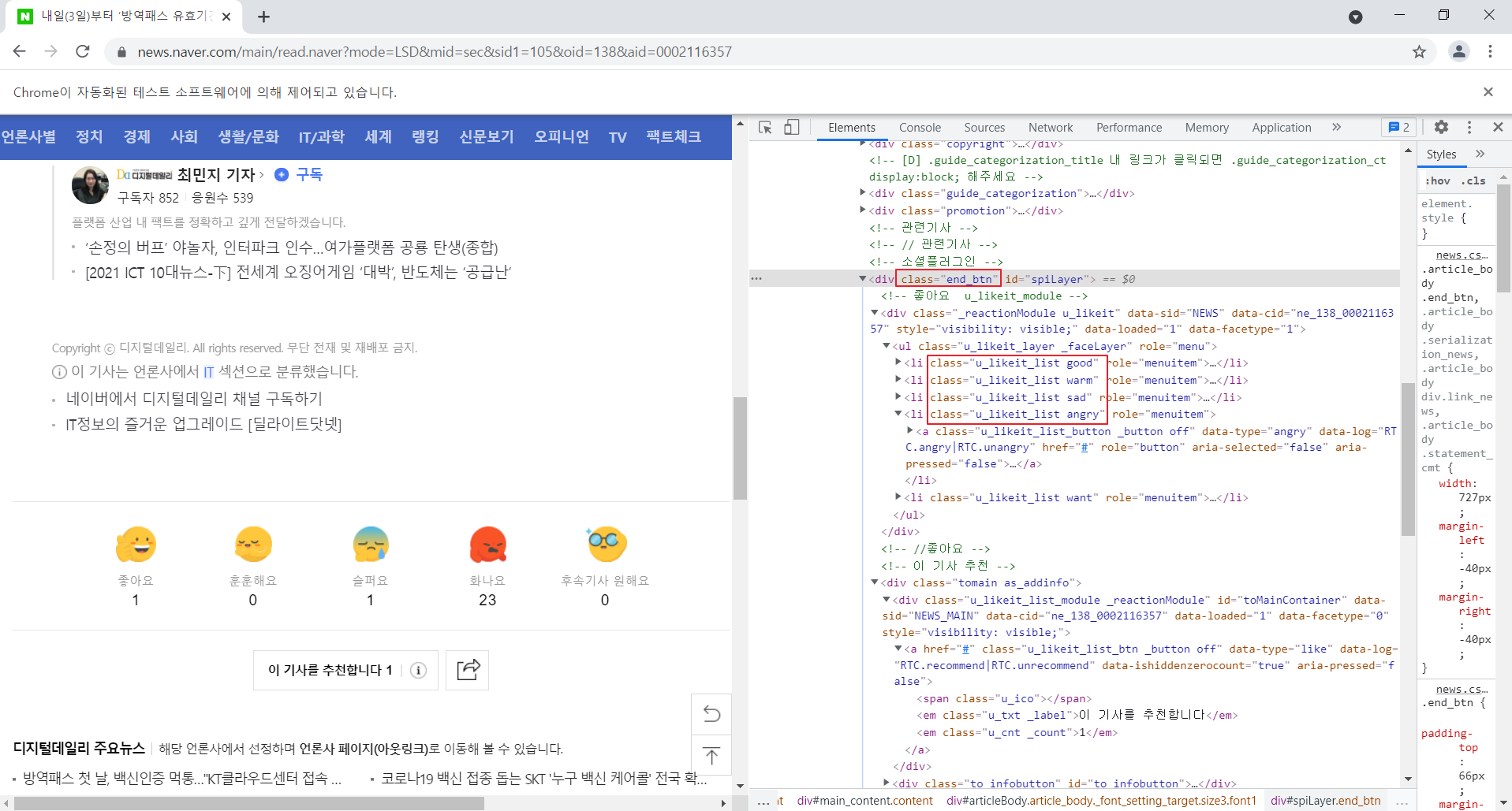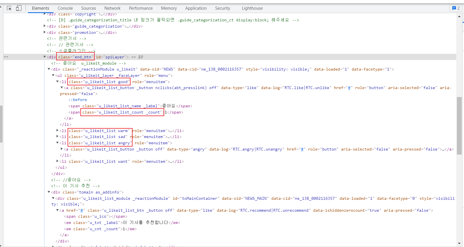 selenium 크롤링에서 가장 애를 먹는 부분이다. 분명 좋아요 수를 직접 가르키는 class를 찾았음데도 에러가 발생할 때가 있다. 부모 클래스 까지 같이 작성을 해줘야 하는데 도대체 어디 부분까지 올라가야 하는지, 코드로 작성을 해야 하는지 어려움을 겪는다. 밑에서는 상위 클래스에 'end_btn' 클래스가 있고 제일 하위에 각각 'u_likeit_list.good/warm/sad/angry/want'로 나뉘어 있다
