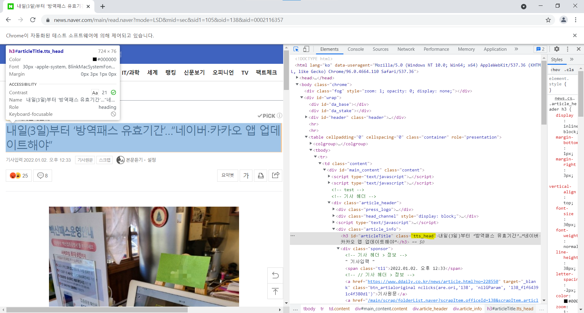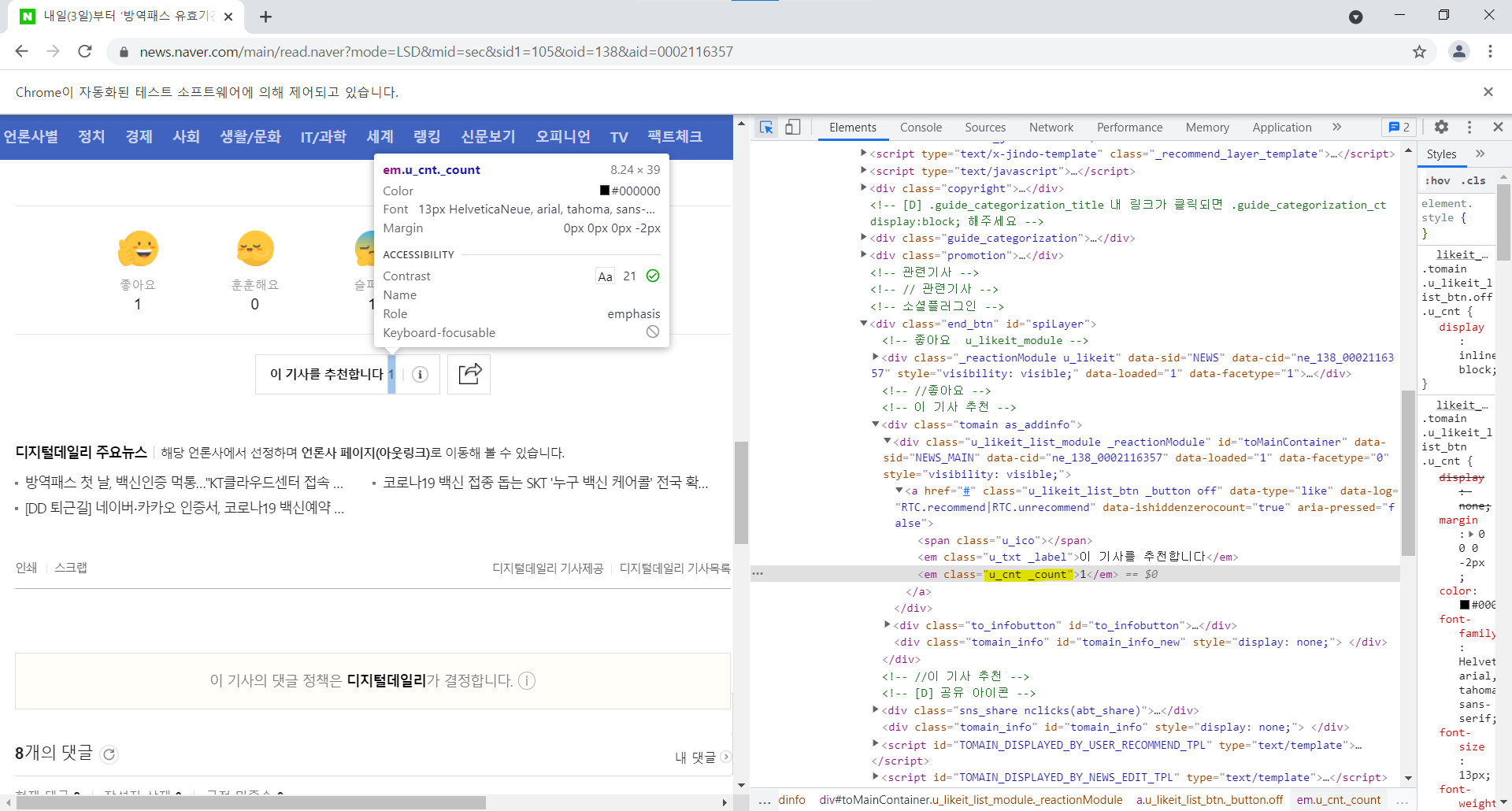 지난 번 네이버 블로그 크롤링과 유사하게 네이버에서 키워드 검색 후 관련 뉴스 기사 크롤링을 실습해 본다. 마찬가지로 처음에는 자동검색을 통해 url들을 수집한 뒤 pandas로 데이터프레임화 한 후 csv로 저장한다. 그 다음 csv를 로드한 뒤 url을 하나씩 열어 기사 본문과 댓글, 좋아요 등의 감정 수집까지 진행한다. 역시나 처음에는 전체 구조를 for문으로 만들기 전에 하나의 기사로 코드를 실험한다.