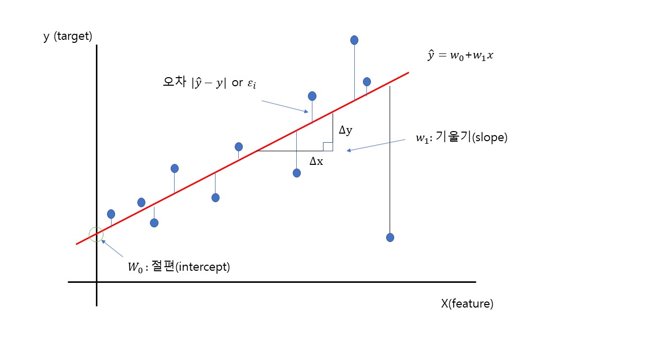 $Y$: 종속변수 / $\beta_0$ : 절편 / $\beta_i$ : 독립변수의 값에 영향을 미치는 회귀계수(기울기) / $X_i$ : 독립변수(피처)