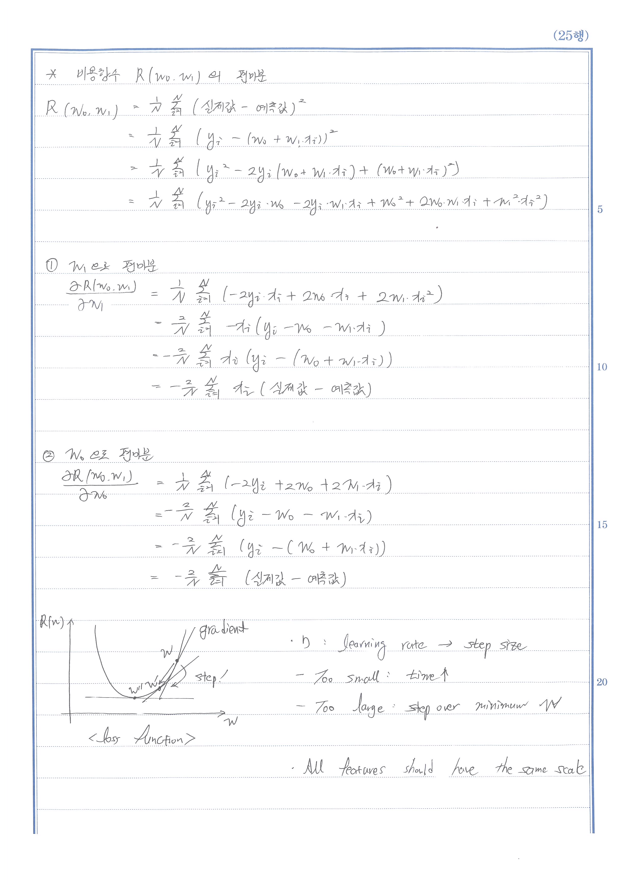 $\frac{\partial R(w)}{\partial w_0}=-\frac{2}{N}\sum_{i=1}^N(실제값_i-예측값_i)$