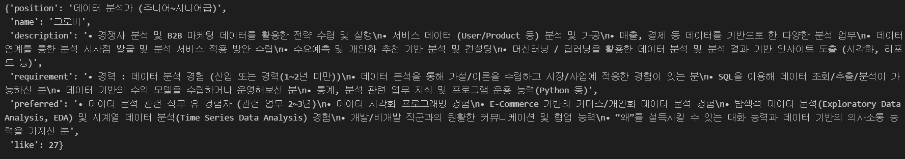 코드의 아웃풋을 보면 성공적으로 데이터 크롤링이 완료되어 딕셔너리 형태로 담기게 된 것을 볼 수 있다. 앞에서도 기술하였듯 하나의 채용 공고를 성공적으로 크롤링 하였다고 같은 방식을 for문이나 while문을 통해 자동으로 반복하여 크롤링할 수 있는 프로젝트 수집의 전체 코드를 작성하는 단계로 넘어간다.