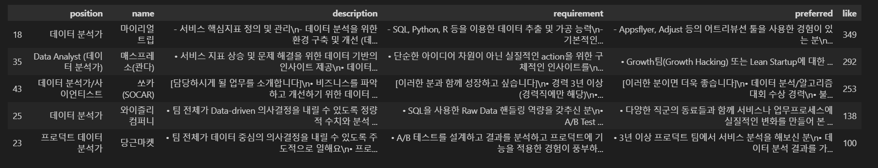 result_df.sort_values('like',ascending=False).head() # 관심 수 기준 정렬