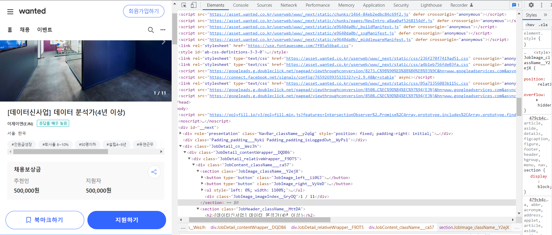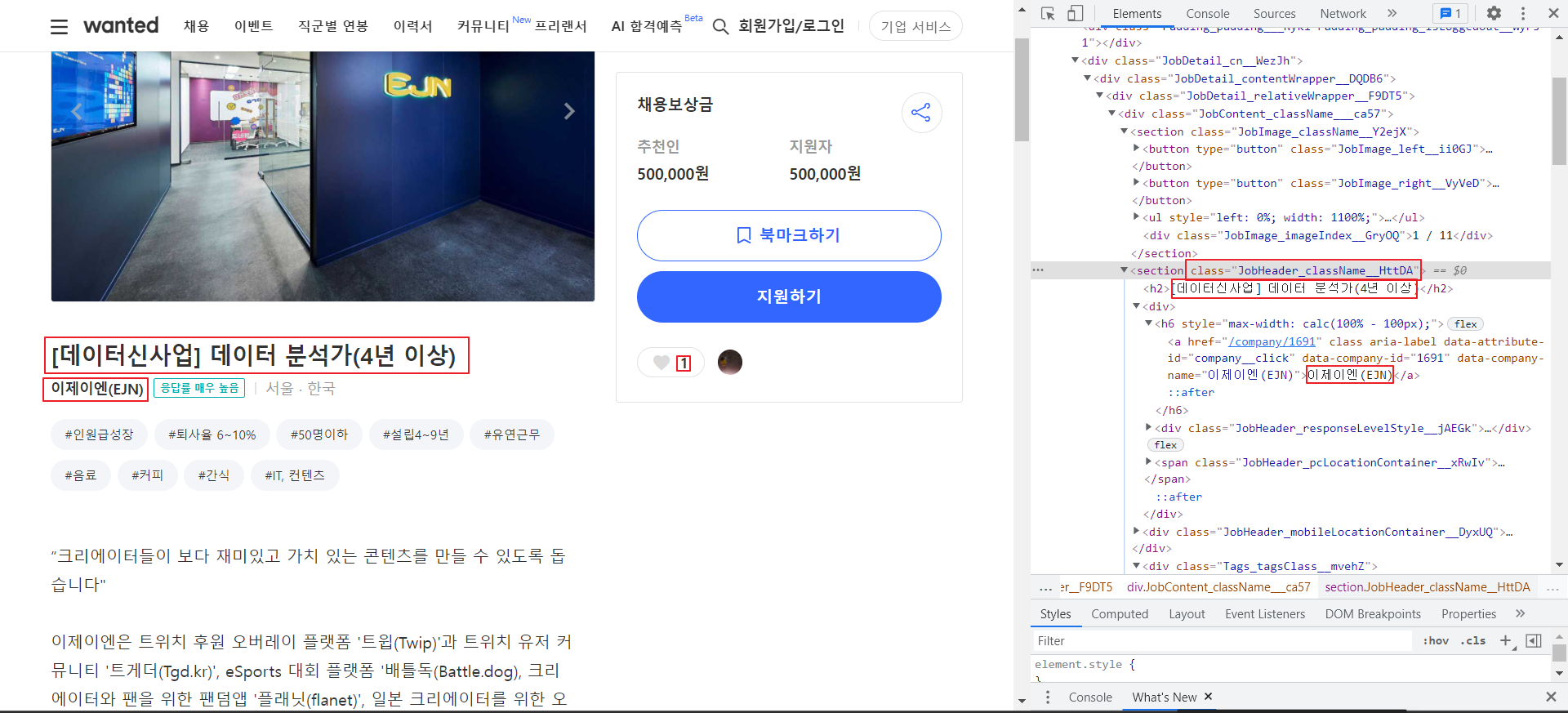 - 포지션과 회사명은 모두 JobHeader_className__HttDA 이라는 클래스에 담겨있다.