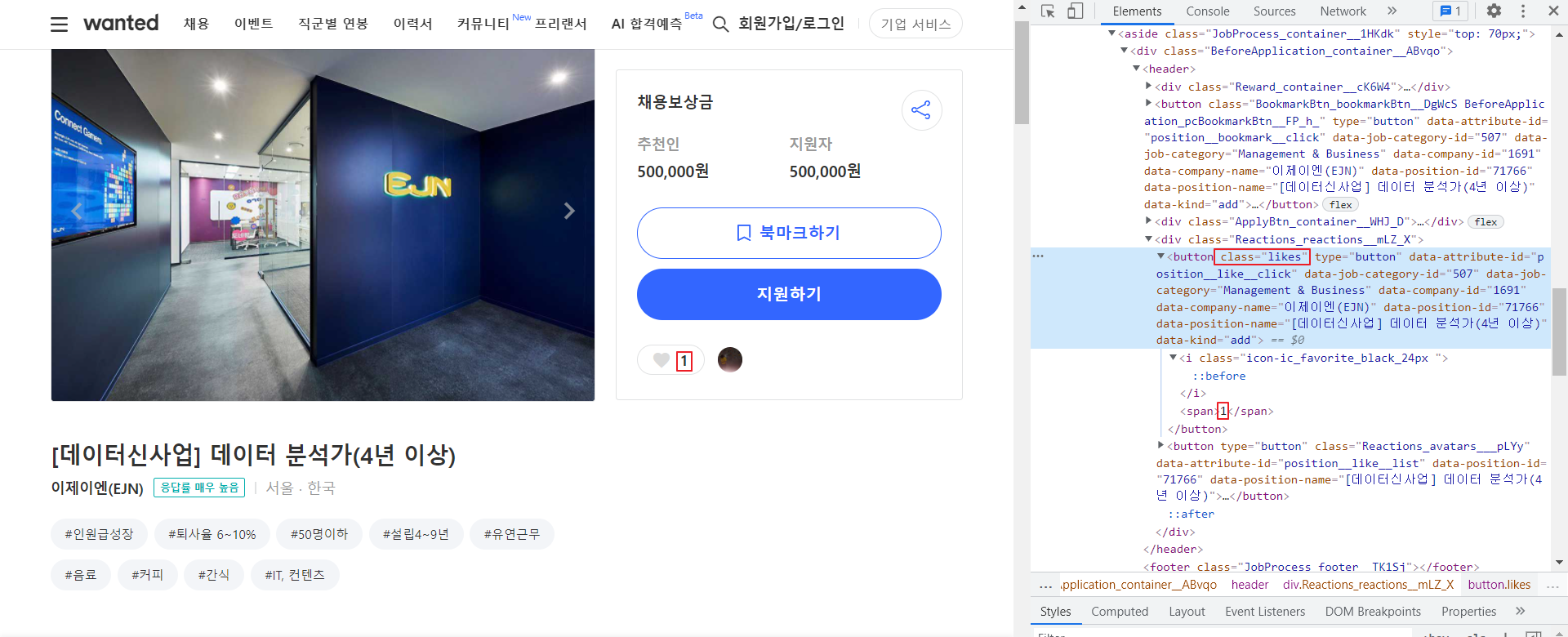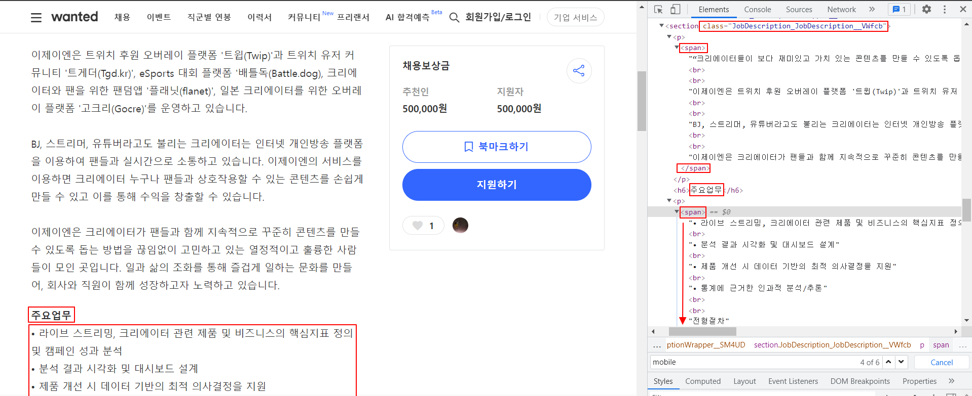 관심 수 크롤링에서 이슈가 발생하였다. selenium을 통해 웹 크롤링을 진행할 때는 보통 F12의 개발자 도구창에서 접근 방식을 고민하게 된다. 그러나 원티드 웹사이트는 일종의 반응형 웹으로 구성되어 있어 개발자 도구 창을 늘리면 두 번째 사진과 같이 모바일 전용 웹 화면을 자동 전환된다. 이 떄는 HTML과 CSS 구성이 모바일 화면에 맞게 자동으로 변경되기 떄문에 반드시 실행하는 webdriver 창의 크기에 맞추어 놓고 크롤링 작업을 진행해야 한다.